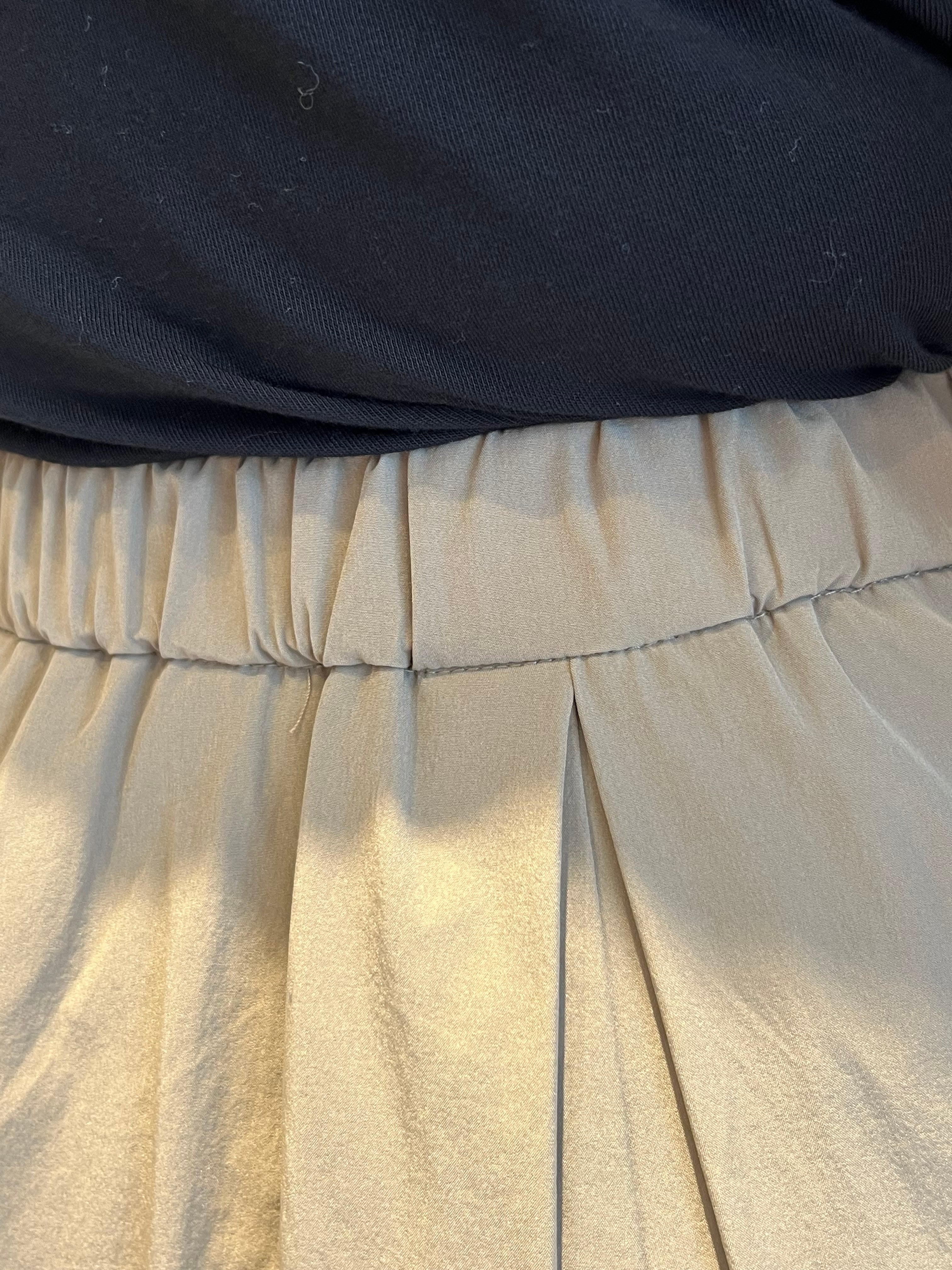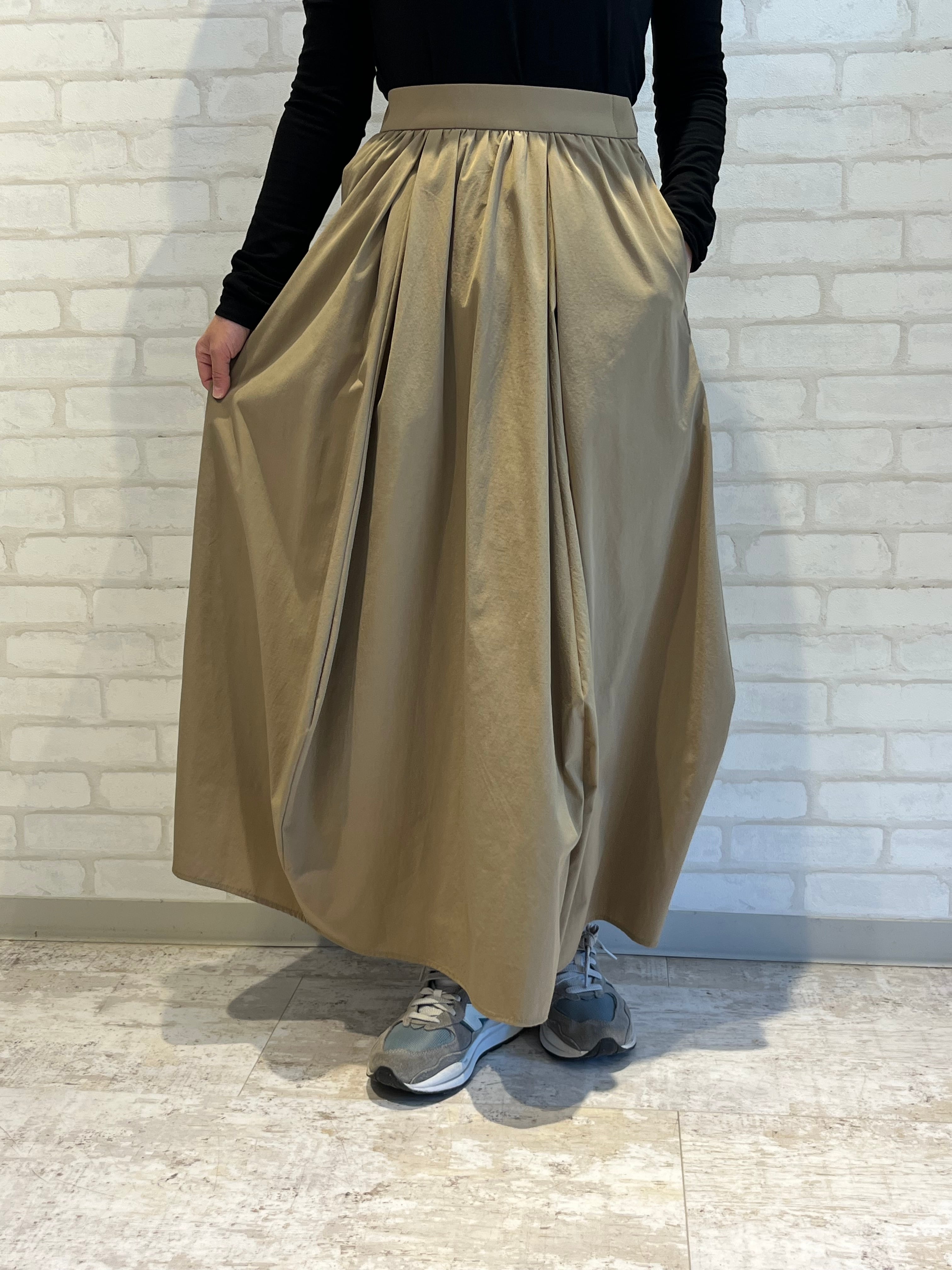 ウエスト下からバランス良くタックが配置され、裾にかけてコクーンシルエット。シンプルながら技ありなシルエットが大人心を擽ります。