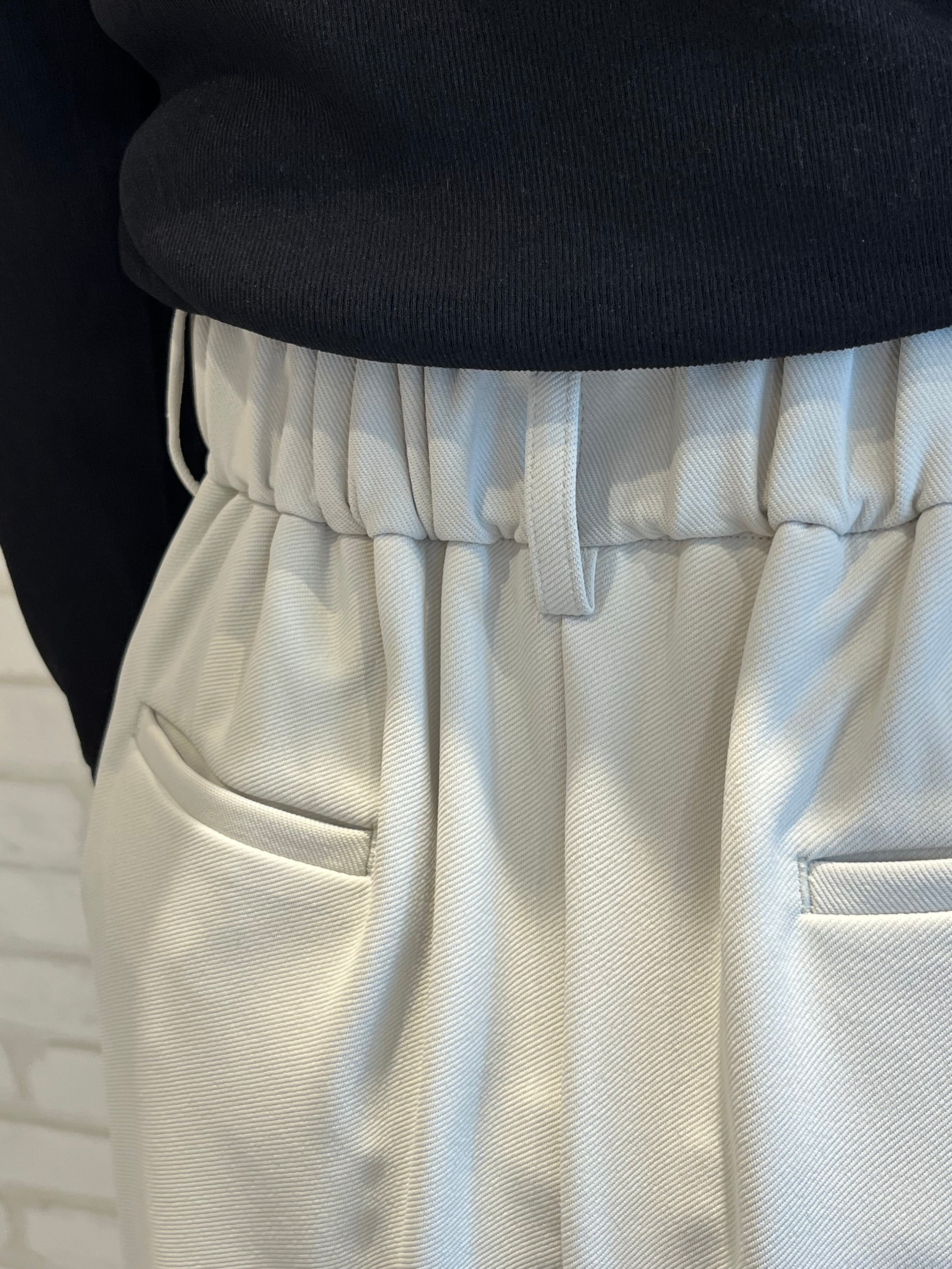 伸縮性がありジャージのような素材を使用した、キレイ目パンツ。