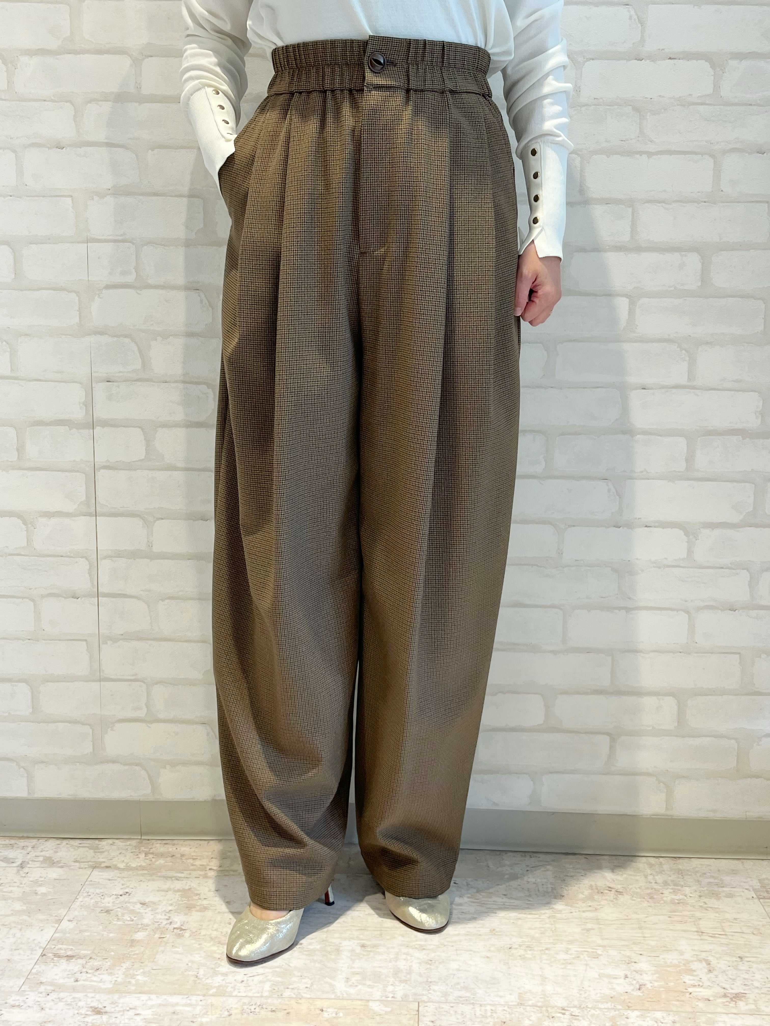 フロントタックがアクセントになった、千鳥格子チェック柄パンツ。