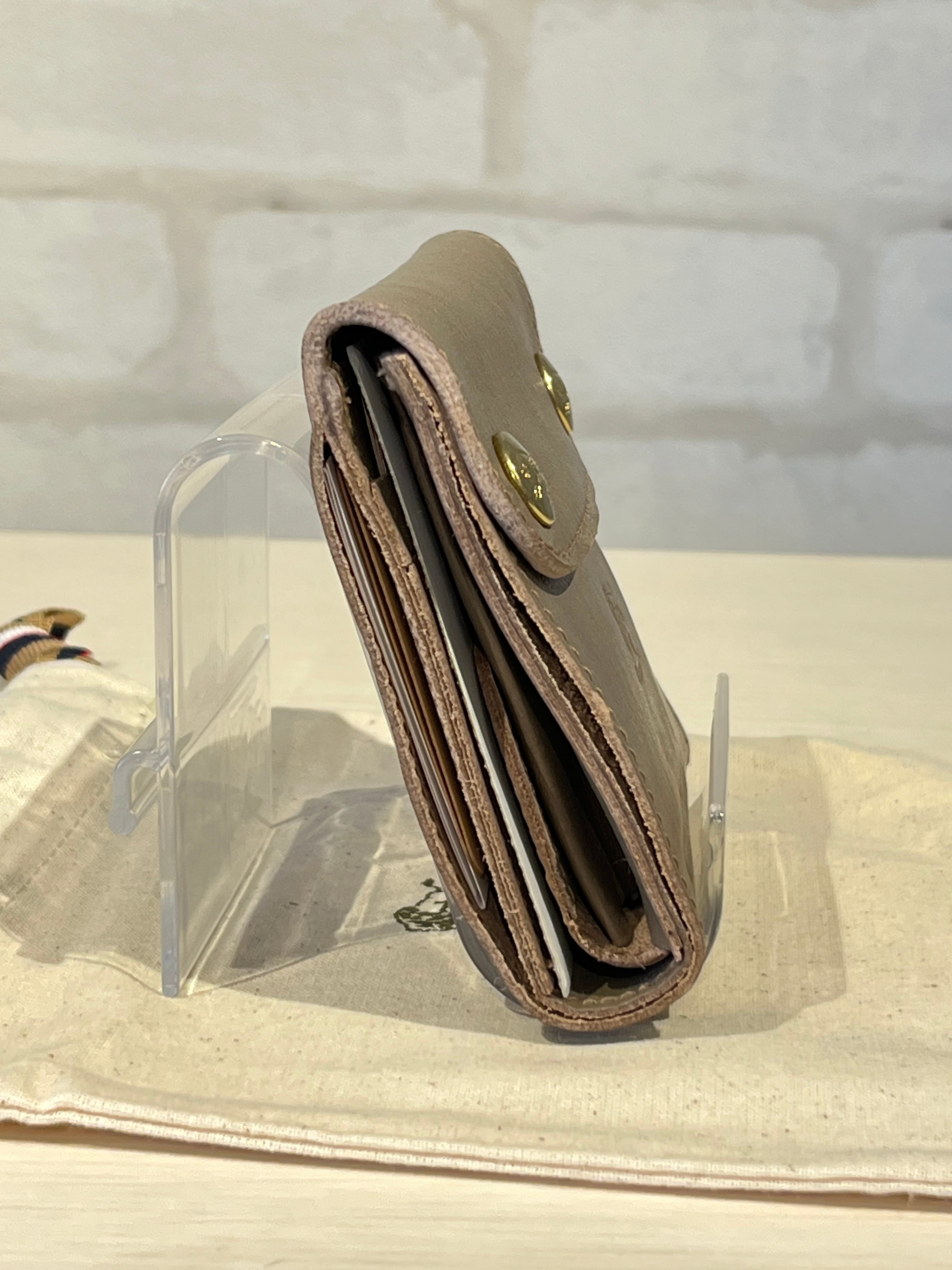 フラップにあしらった2つのメタルボタンで華やかさを添えたレザーウォレット。