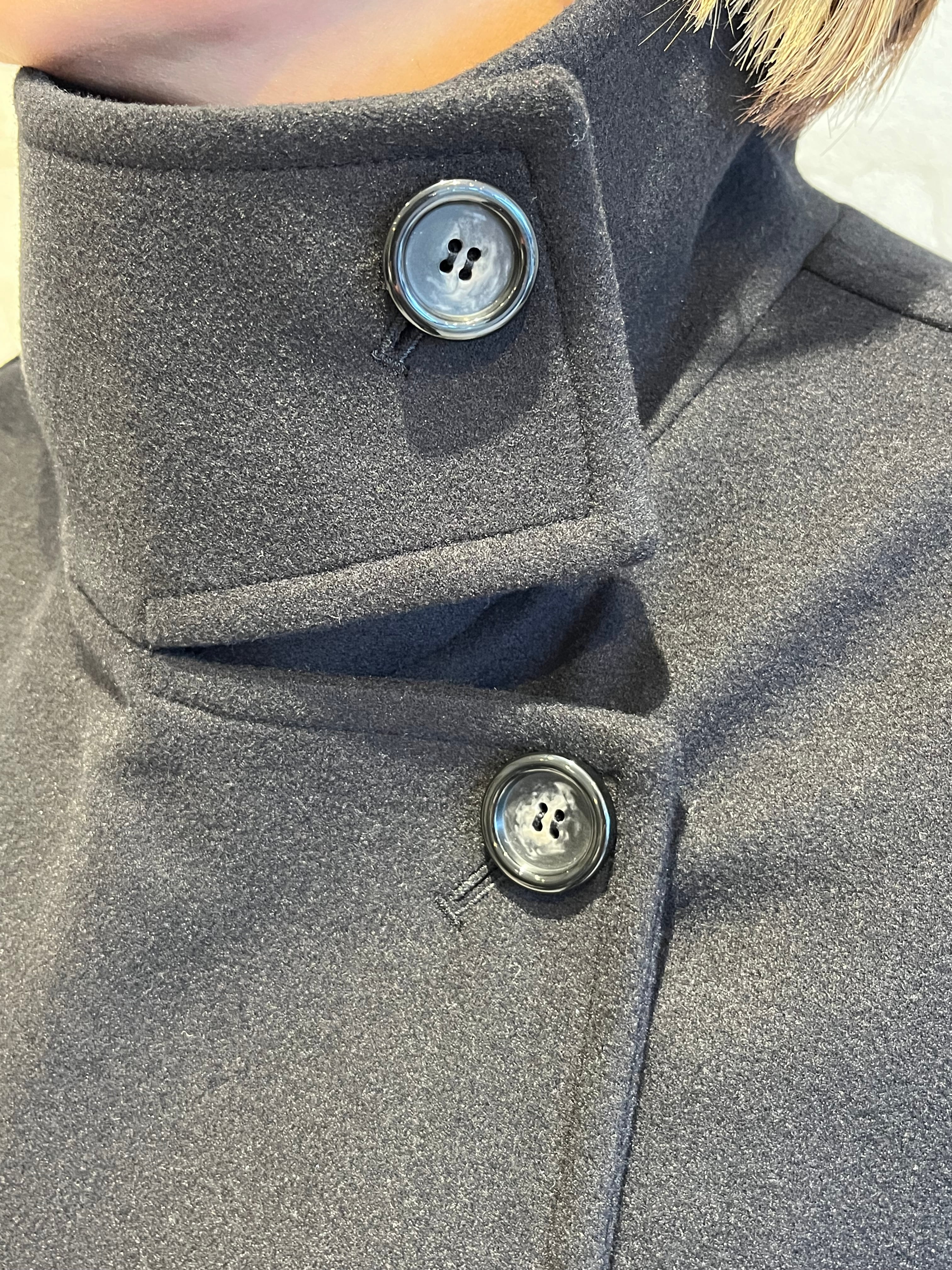 衿元はオープンにしても、ボタンを閉めてスタンドカラーにしても、アレンジが楽しめるデザイン。