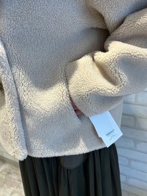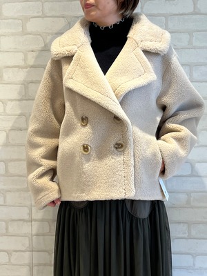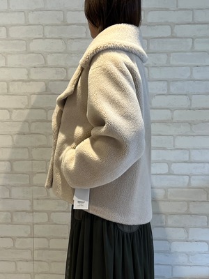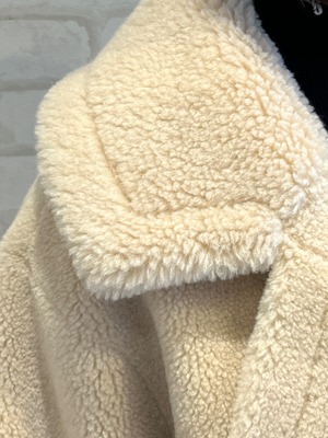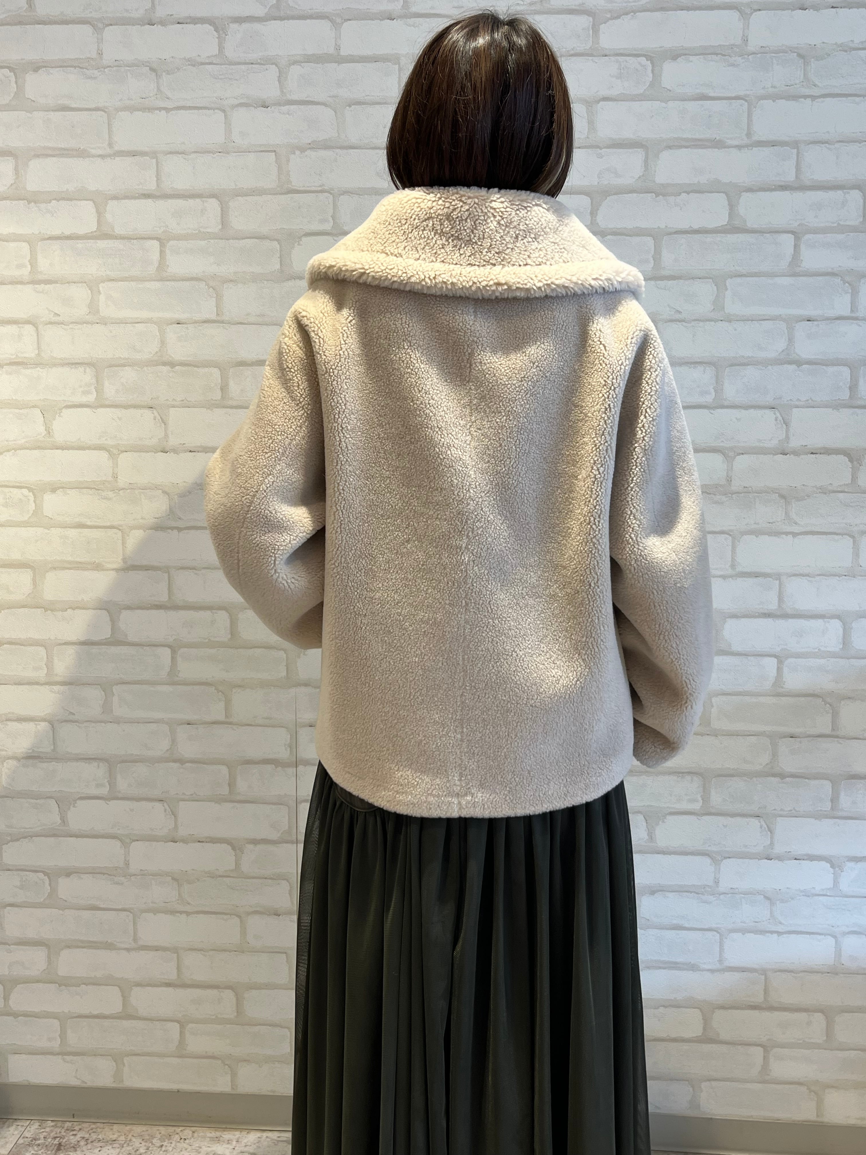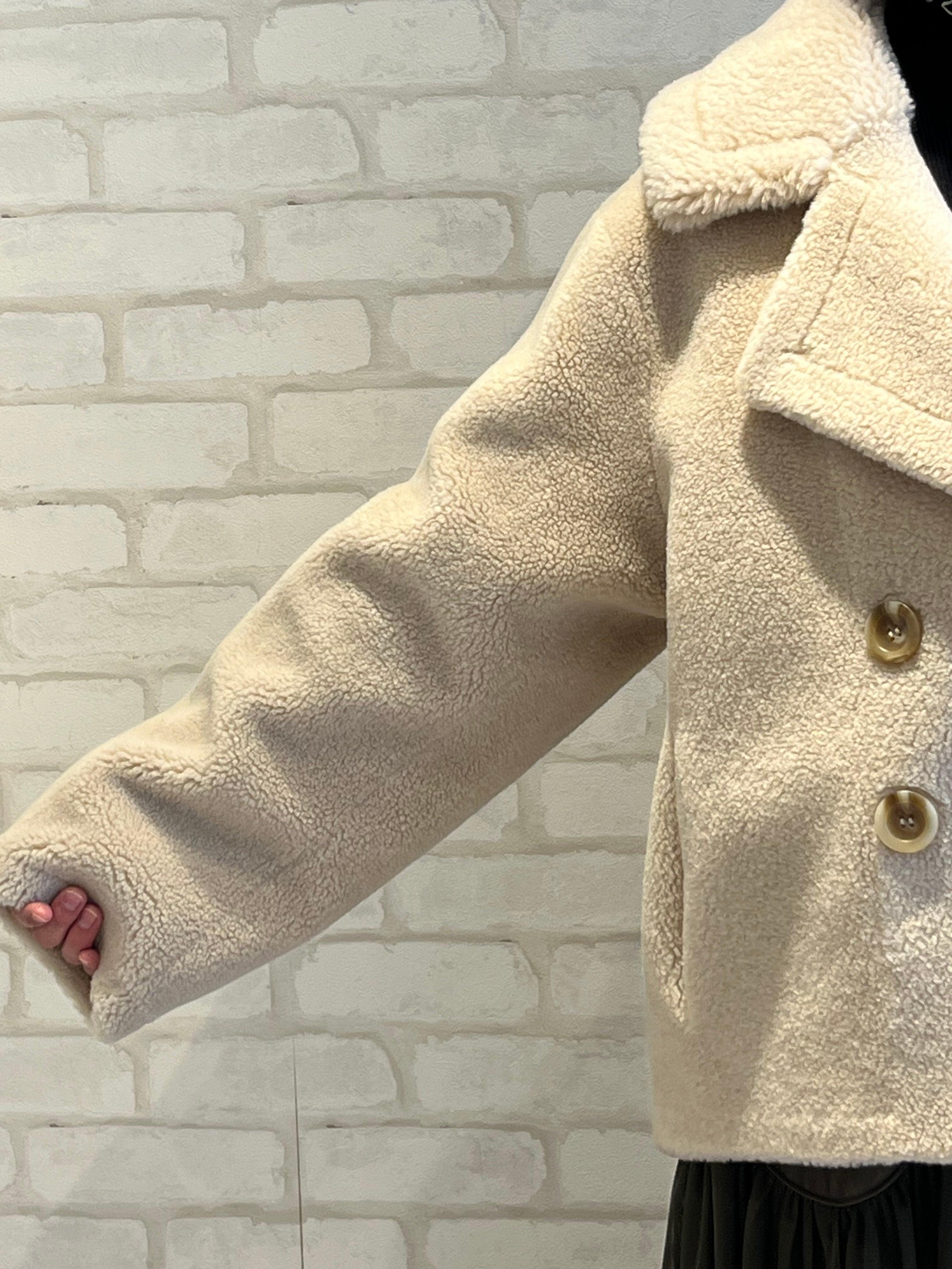 大きめな襟とややゆとりある袖が特徴的なボア素材のPコート。