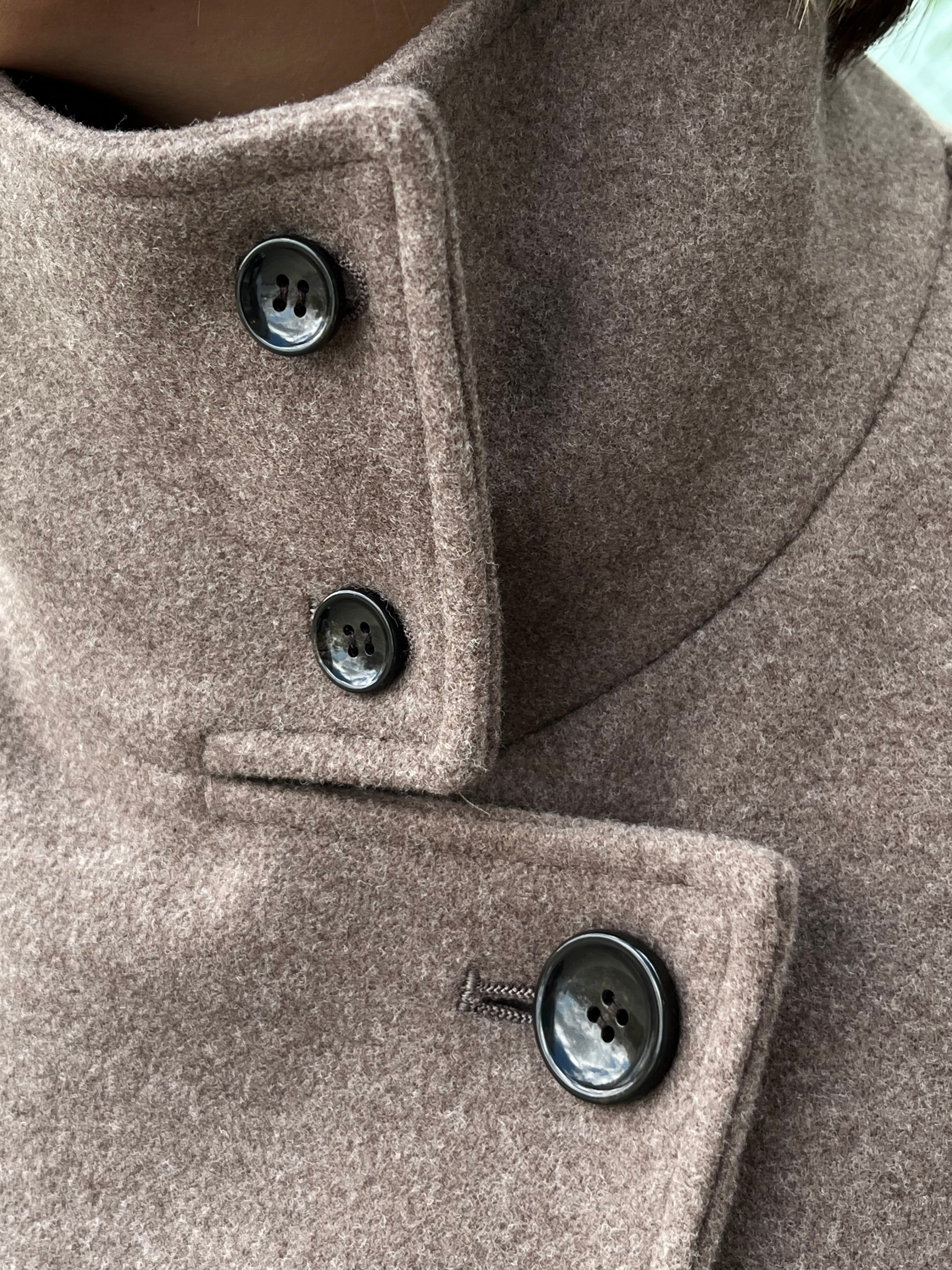 首元の3つのボタンで留める、スタンドカラーのコート。