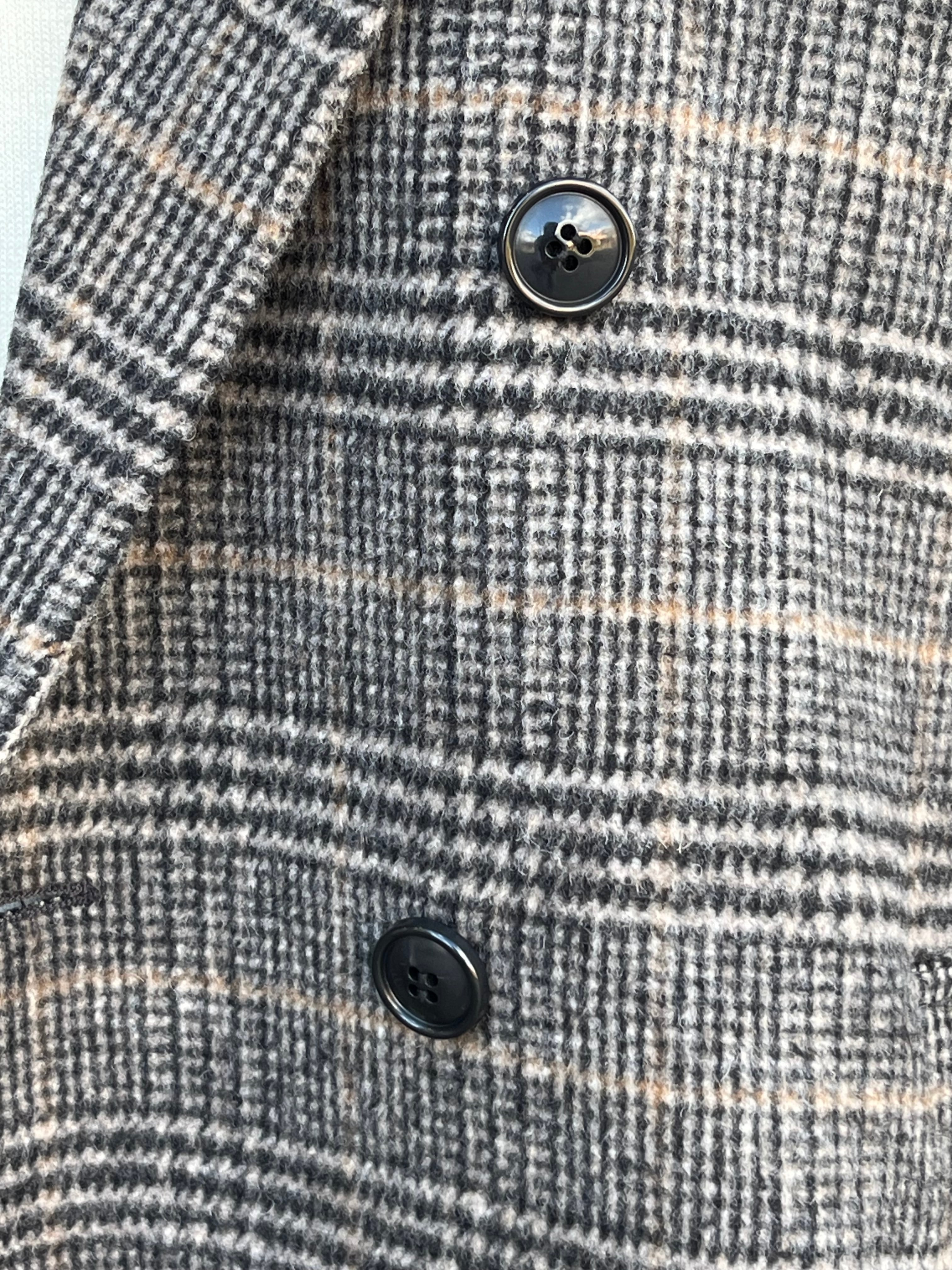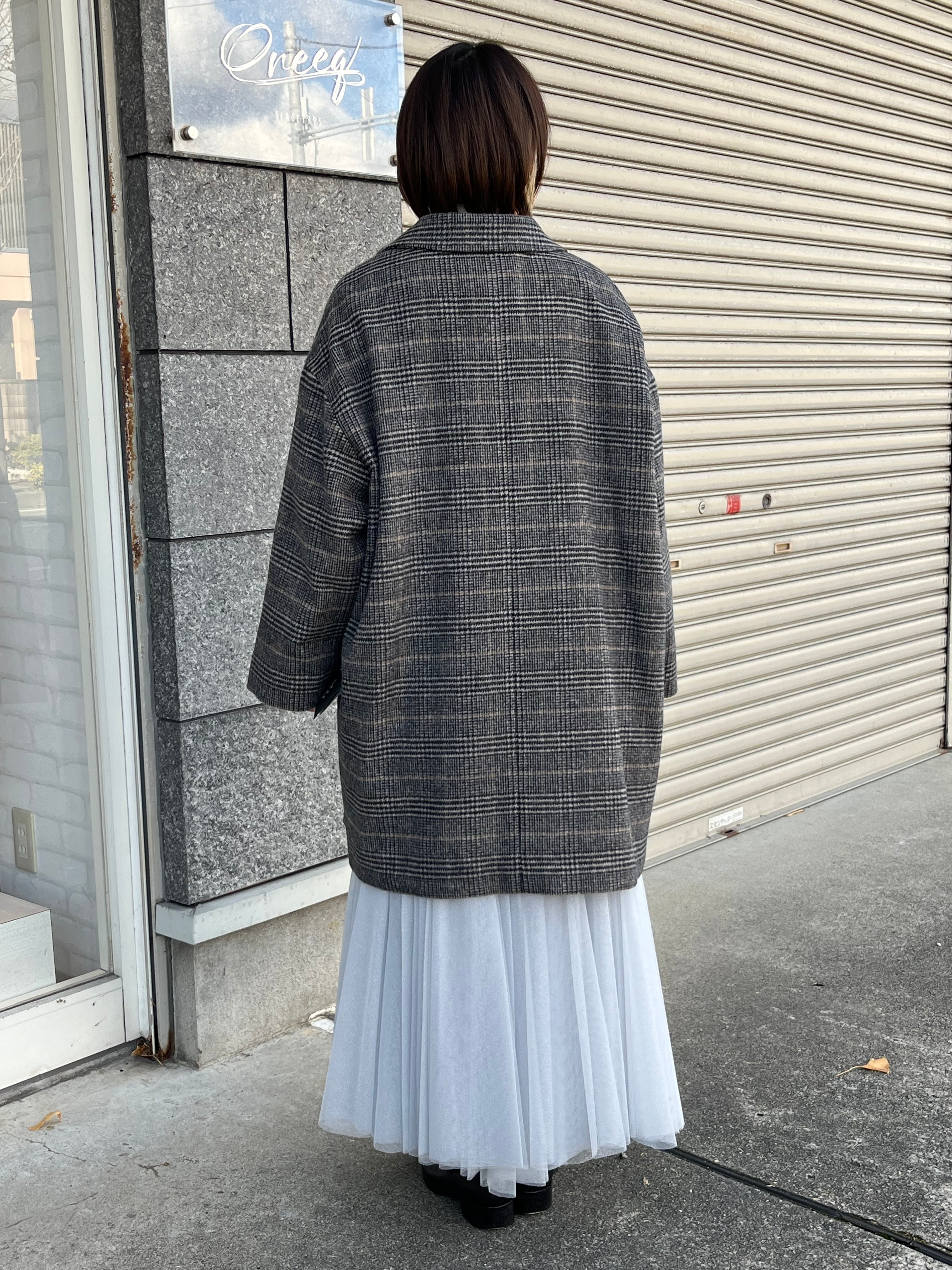 柔らかく上質のウール混チェック柄が、秋冬シーズンにマッチする、ダブルジャケット風コート。