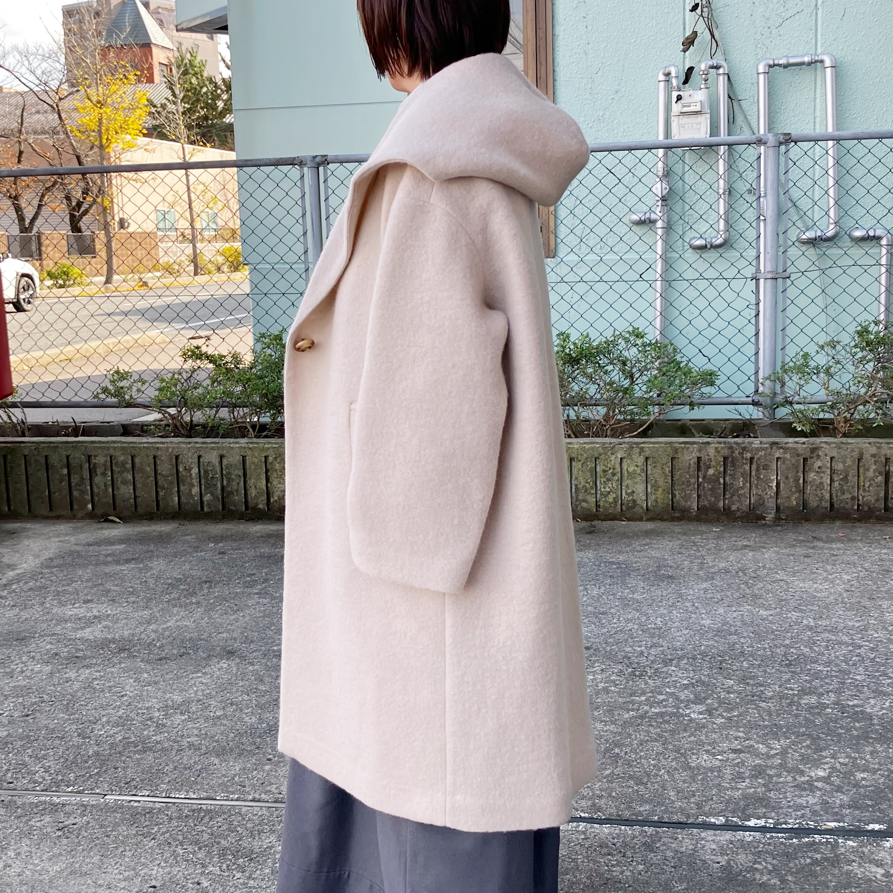 大きなフード風のショールカラーがアイコニックなセミロングコート。