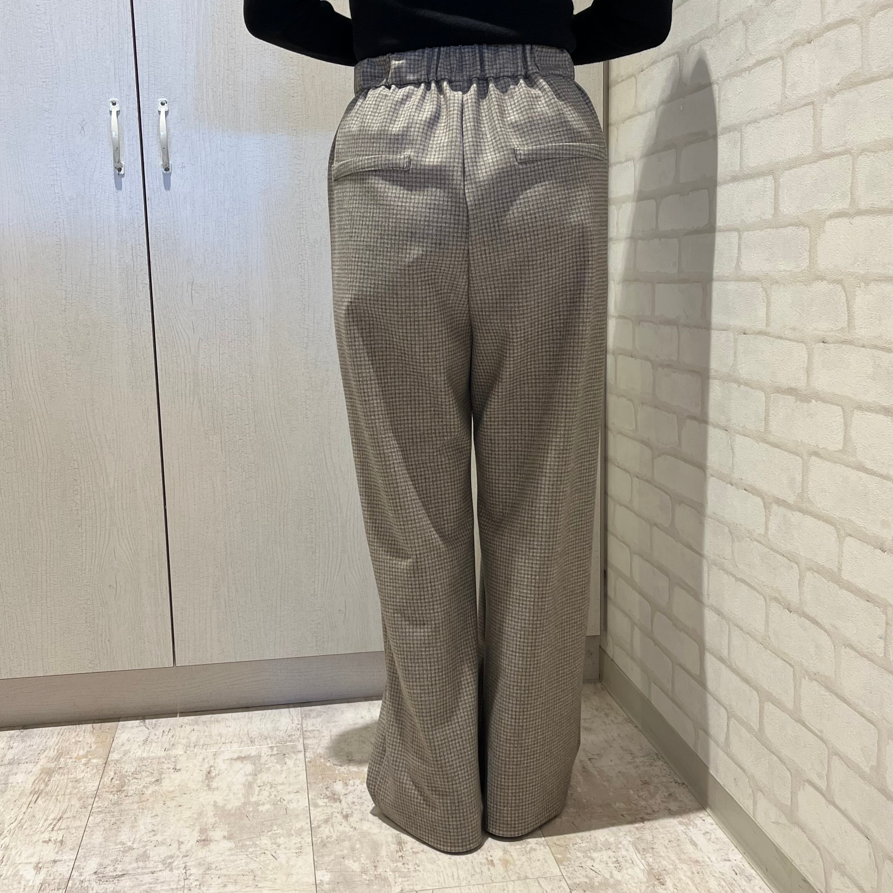 フロントがタイパンツ風デザインになった、チェック柄パンツ。